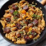 This Autumn Beef Sausage Pasta with Roasted Butternut Squash is a hearty and flavorful dish perfect for the cooler months. Featuring tender roasted butternut squash and Brussels sprouts paired with savory smoked beef sausage and al dente bow tie pasta, this recipe blends fall vegetables with robust spices like smoked paprika and fresh thyme. The combination offers a comforting meal that’s both easy to prepare and packed with rich autumn flavors.