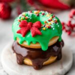 While the chocolate coating on each cookie is still wet, gently press a Twizzler bow onto the center to mimic a festive wreath bow. Then sprinkle green and red Christmas sprinkles all over the wet chocolate; these mimic holly berries and add a delightful crunch and splash of color. Repeat this process for every cookie, turning each into a mini holiday masterpiece.