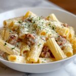 This Creamy Garlic Sausage Alfredo Rigatoni recipe combines perfectly cooked rigatoni pasta with flavorful garlic sausage and a rich, homemade Alfredo sauce. The sauce is made with heavy cream, Parmesan cheese, and a hint of chicken broth, creating a luscious and comforting dish that’s easy to prepare in just 30 minutes. Garnished with fresh parsley, this meal is perfect for a satisfying weeknight dinner.