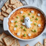 Once out of the oven and slightly cooled, it’s time for the fun part — decoration! Use sour cream mixed with black food coloring (if you like) to pipe concentric circles on the dip, then drag a toothpick outward to form a spooky spiderweb. Cut ghost shapes from white cheese slices, place them on top, and add eyes with black decorating gel or tiny olive pieces. These festive touches turn an already amazing dip into a Halloween star!