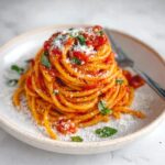 Just before the sauce finishes cooking, fold in the torn or chopped basil leaves for that signature fresh, aromatic pop. Drain the pasta once it’s perfectly cooked, then toss it with the sauce until every strand is gloriously coated.