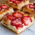 Delight in these easy-to-make Strawberry Danish pastries featuring flaky puff pastry filled with a luscious cream cheese mixture and fresh, tangy strawberries. Perfect for breakfast, brunch, or a sweet snack, these Danish pastries combine a crisp, golden crust with creamy filling topped with fresh fruit and a touch of sweetness.